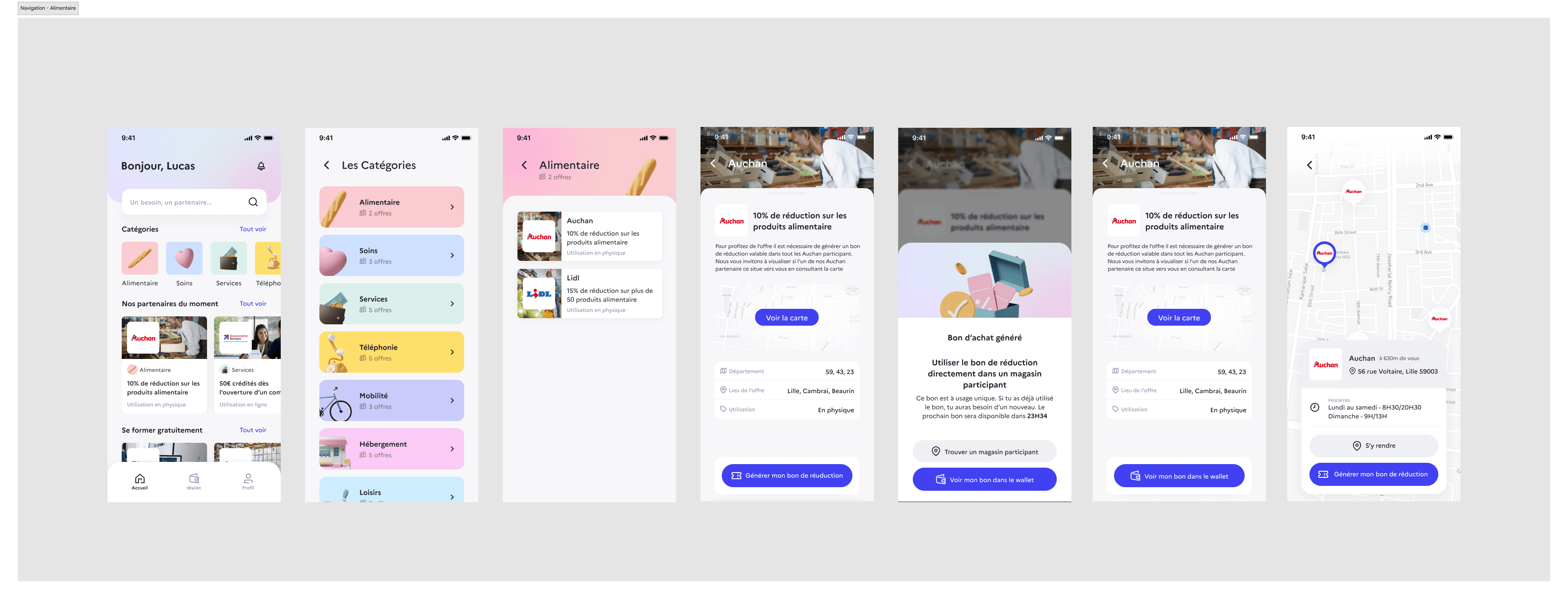 Nous avons ensuite réalisé des wireframes pour mieux nous projeter, en nous appuyant sur le user path pour concevoir les écrans principaux. Cela nous a permis d’obtenir un premier retour client sur notre analyse et nos idées.